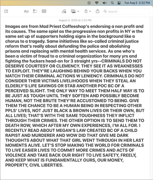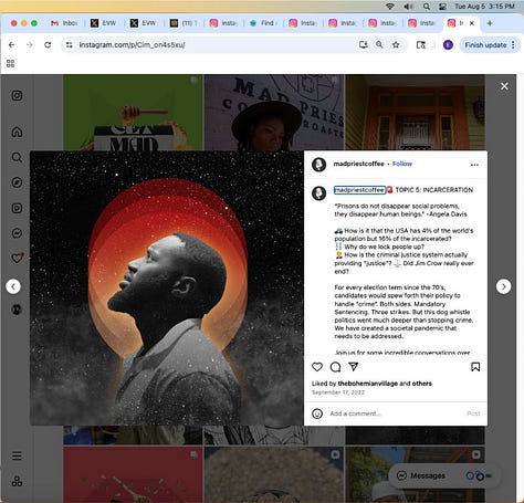 Screenshots above: Screenshots are from the non profit endorsed by Mad Priest coffeeshop. “Black History is everyday”, according to the criminals, which translates as they come first and foremost in our lives; they are #1 priority before our friends, family and our own wants/needs. Harvard Law School, a Saturday tour on black history/culture. Criminal Justice reform, one of the criminals' top initiatives in making society accommodate them, which so far, at least in NY, they've done a great job! Recidivism is out of control here and felons live better lives than I do.