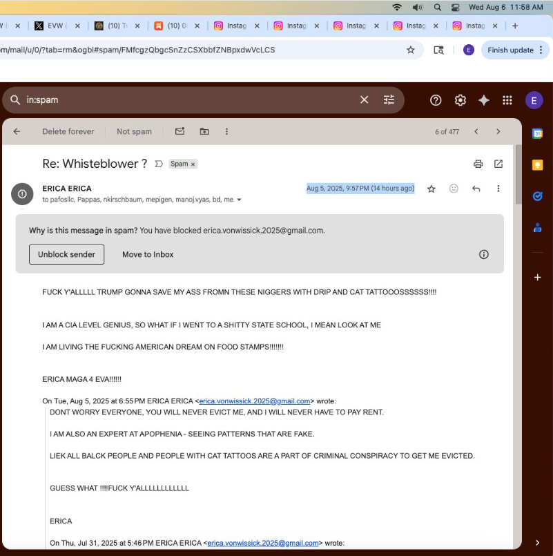 Screenshot above: Latest doxxing email from the criminals. Found in spam. Looks like they're emailing friend's daughter, his consulting job, the landlord, the landlord's lawyer, and others who I don't know.