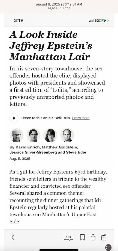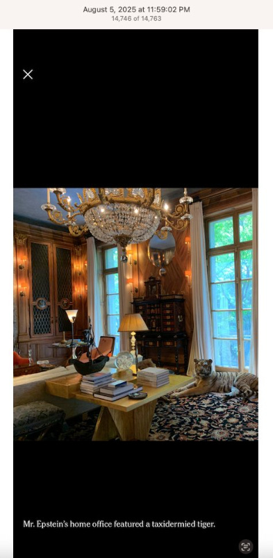 Screenshots above: Hardly a day doesn't go by that NYT doesn't have some kind of representation of a lion/big cat. Tonight it was Epstein's townhouse with a taxidermy tiger.