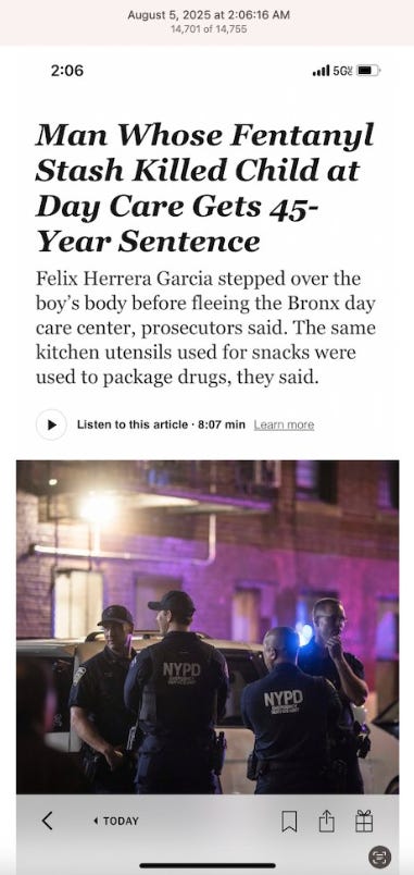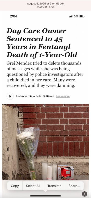 Screenshots above: Same deal with a daycare that was really a cover for a stash house of fentanyl and other narcotics by undocumented immigrants who have been in the U.S. for years. How did she get a license or permit or whatever is needed to open a daycare? Corrupt agencies in NYC, that's how. Four toddlers were poisoned, including a 1yo who died, because the utensils and dishes they ate from were the same the drug-dealing couple used to prepare the drugs.