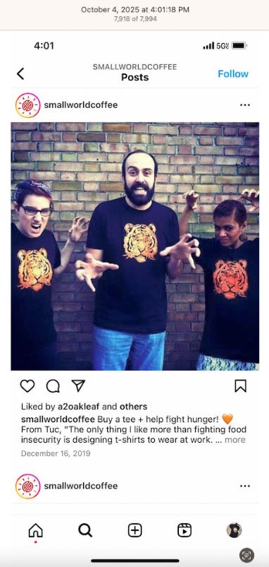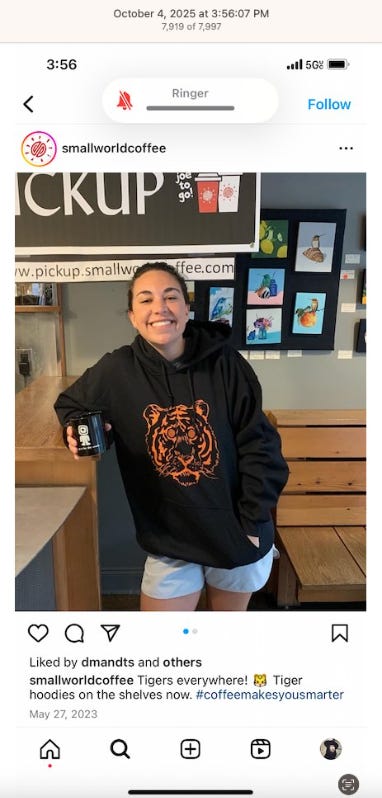 Screenshots above: Small World Coffee has a big cat with crown for its logo and big cats on its merchandise.