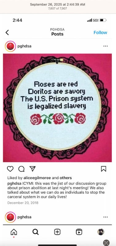 Screenshots above: Democratic socialists of America: “The US prison system is legalized slavery.” No, the U.S. prison system is intended to serve as justice to those who are the victims of criminal actions, such as rape, murder, theft, assault, and to protect the public from further criminal actions by the same person. When someone does something criminal, she should face the consequences of her actions because it did real damage to someone else’s life. Along with the usual, Defund the Police and radicalization.